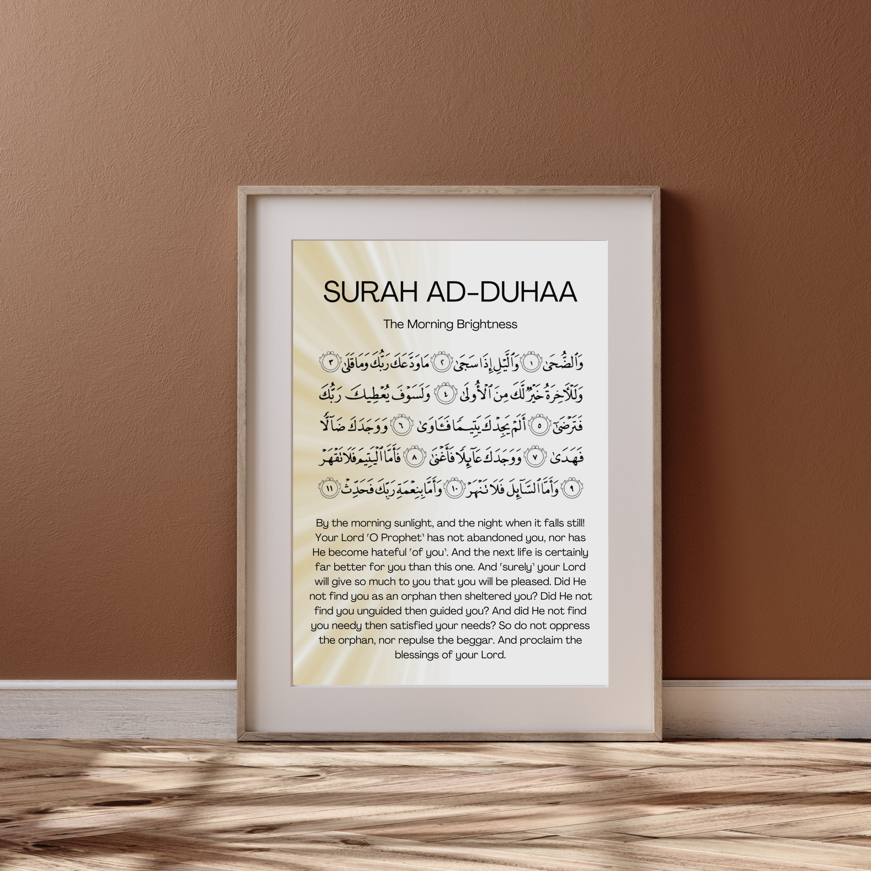 A beautiful reminder of hope, reassurance, and Allah’s unwavering mercy, our Surah Ad-Duhaa prints capture the essence of light after hardship. This sacred Surah speaks of renewal, divine love, and the promise that better days are always ahead.