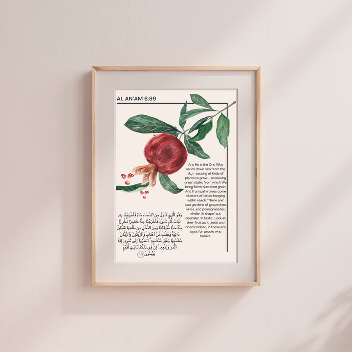 A symbol of abundance, healing, and barakah, the pomegranate is one of the blessed fruits mentioned in the Qur’an. Our hand-painted Ruby of Jannah print beautifully captures its rich, jewel-like tones and intricate details, bringing a touch of divine elegance to your space.